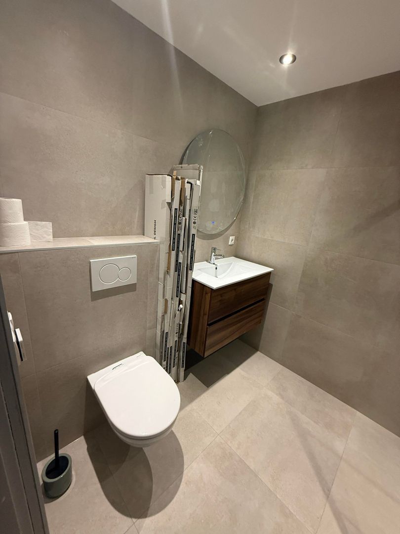 Een moderne, geheel betegelde doucheruimte met vaste wastafel, douchecabine, een toilet, wasmachineaansluiting en elektrische afzuiging.