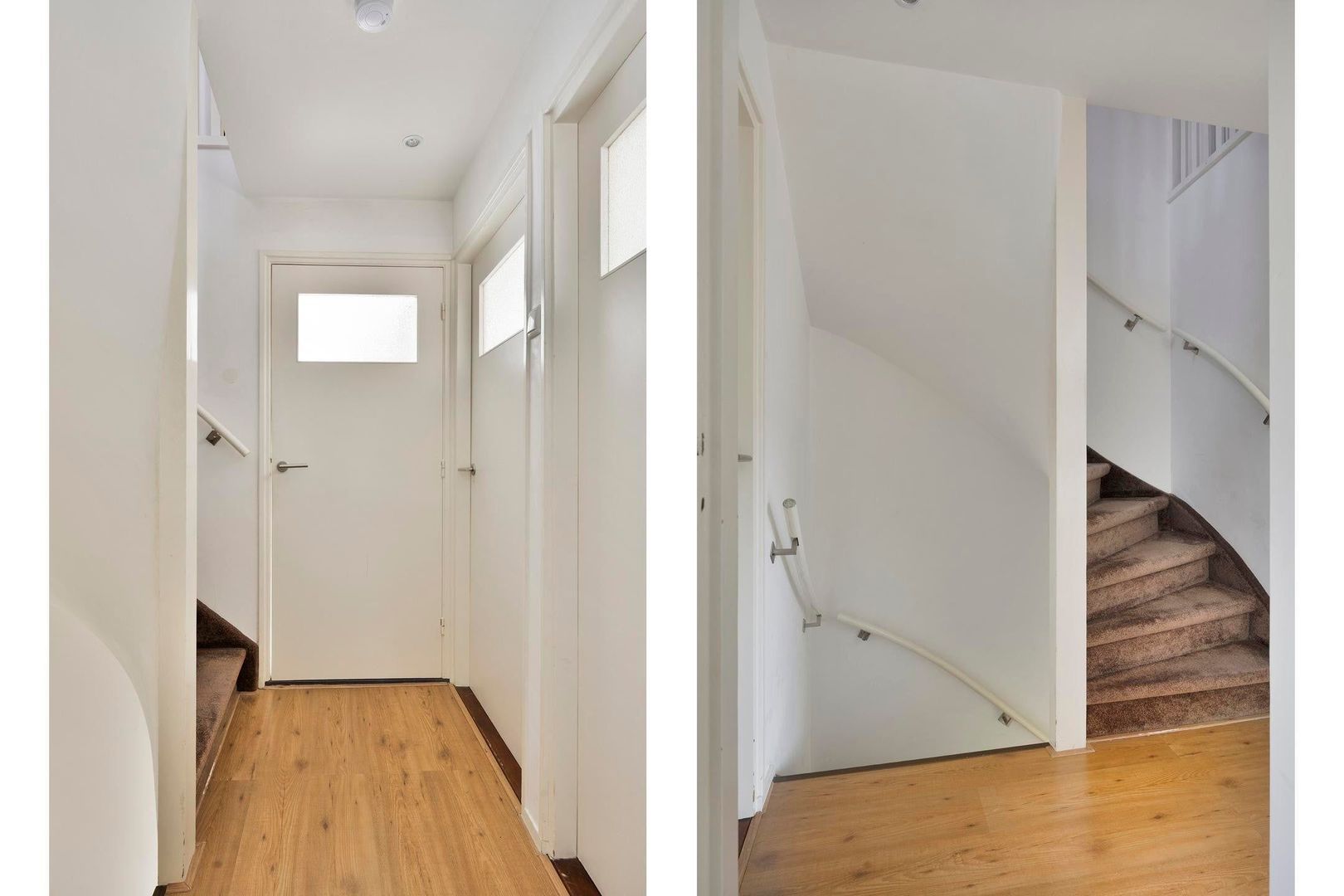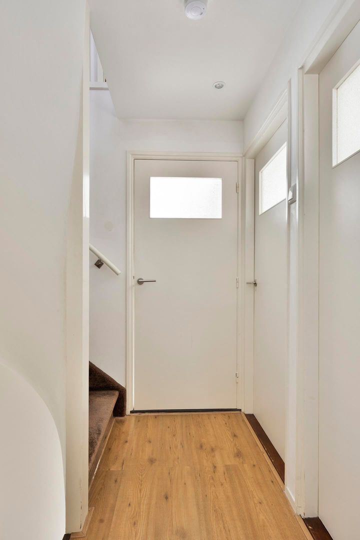 Bij binnenkomst stap je in de ruime hal die toegang biedt tot het toilet, de meterkast, de woonkamer en de trap naar de eerste verdieping. De hal is netjes afgewerkt met een moderne pvc-laminaatvloer die doorloopt in de woonkamer.