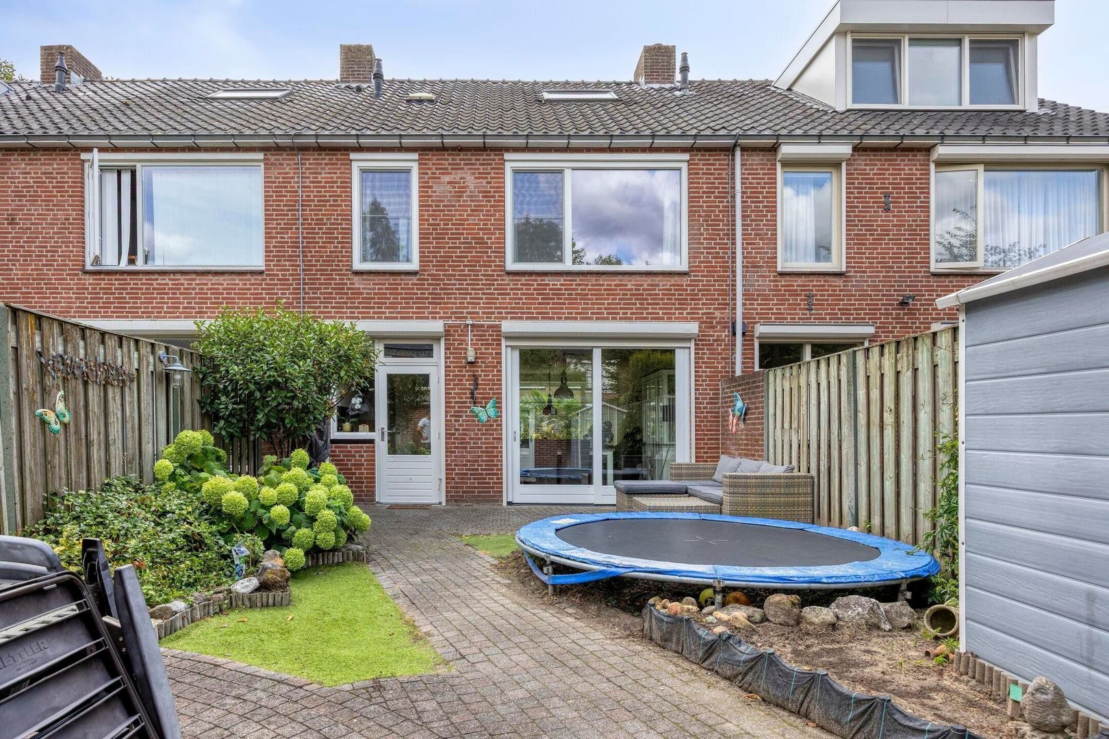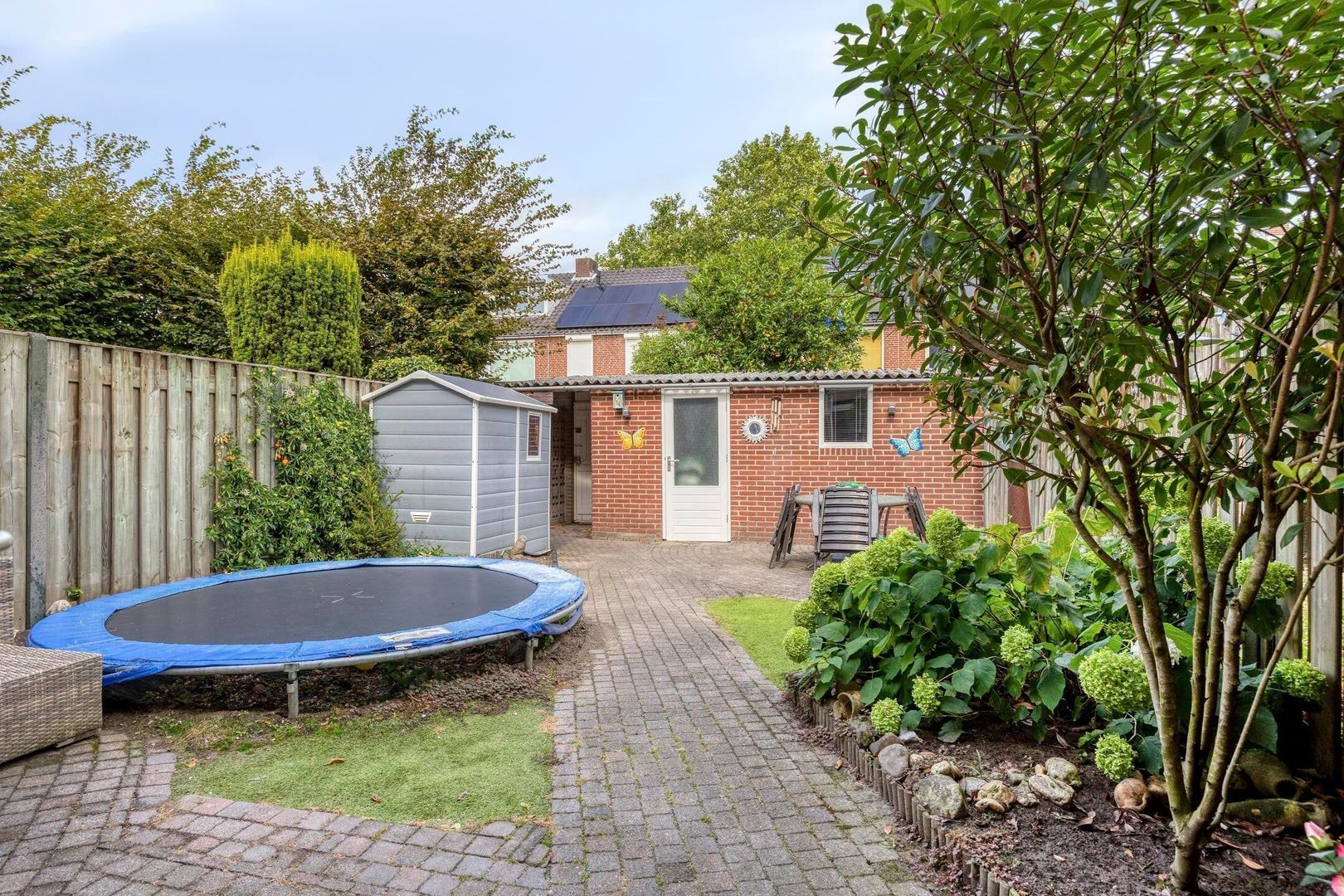 De achtertuin is gelegen op het noorden en is onderhoudsvriendelijk aangelegd. Er is een schuur met betonnen vloer en ramen voor natuurlijk licht, en een achterom biedt extra gemak. De tuin is een prettige plek om te ontspannen of een extra buitenruimte te creëren.
