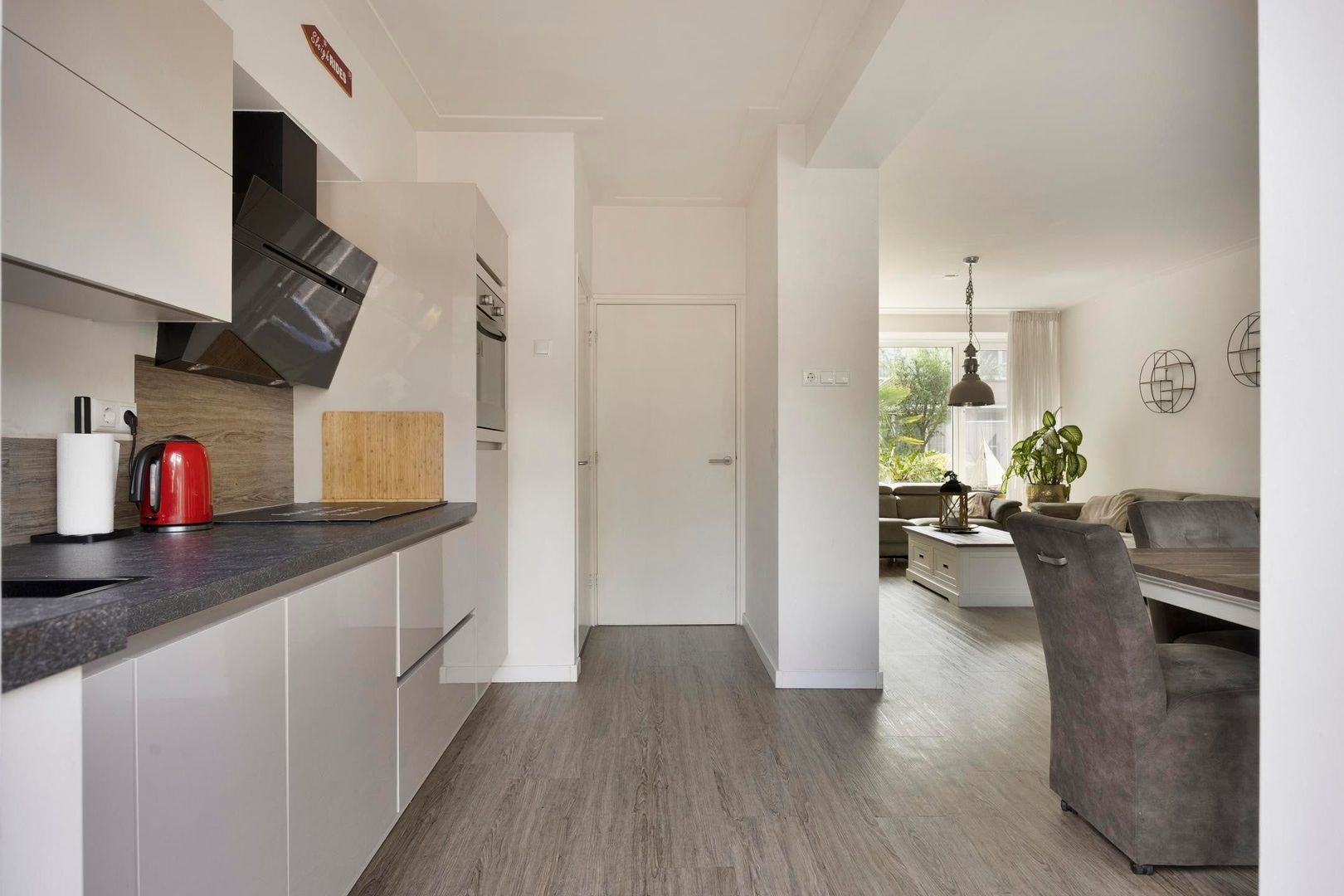 De woonkamer is licht en ruim dankzij de grote raampartijen aan de voor- en achterzijde. Het kozijn aan de voorzijde is voorzien van een draai/kiep raam met inzethor. De wanden zijn strak gestuct en de vloer is afgewerkt met pvc-laminaat. Vanuit de woonkamer is er direct toegang tot de achtertuin via een hardhouten schuifdeur (2019). De achterzijde is voorzien van rolluiken voor extra privacy en comfort. Tevens is er toegang tot de tuin via de deur in de keuken.