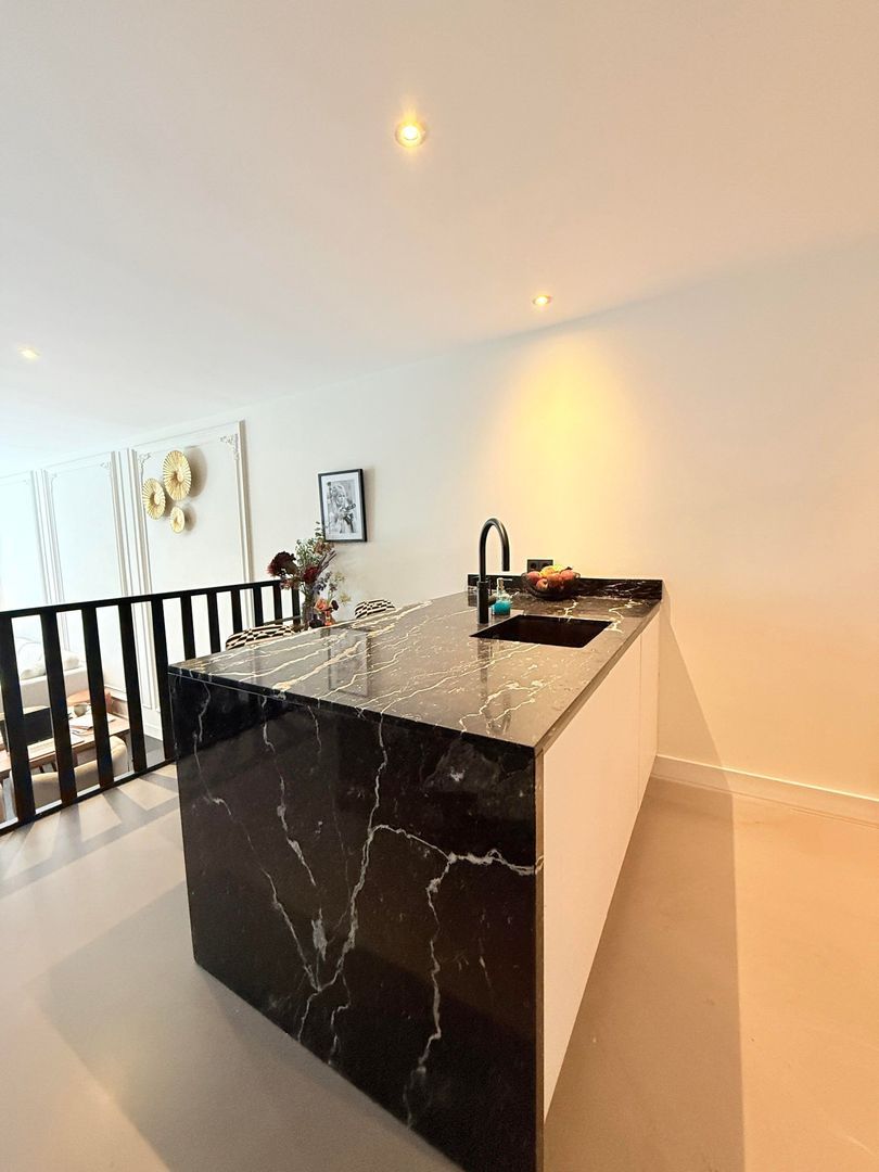 Keuken, bij binnenkomst in de keuken valt direct het strakke en moderne design op. Het ruime eiland biedt niet alleen voldoende werkruimte, maar ook een gezellige bar. Het marmeren blad in combinatie met de strakke en tijdloze keuken geeft de keuken een luxe, maar toch uitnodigende uitstraling. De hoogwaardige inbouwapparatuur, zoals een gloednieuwe recent geplaatste Quooker heetwaterkraan, een inductiekookplaat met geïntegreerde afzuiging en een ingebouwde koelkast maken van koken een plezierige ervaring. De keuken is ook volledig voorzien van servies, koffiezetapparaat, melkopschuimer en andere keukenbenodigdheden. Een praktische berging met extra keukenkasten is voorzien van een diepvriezer, wasmachine, droger, strijkplank en strijkbout, steelstofzuiger, droogrekken, poetsspullen zoals emmer, dweil, veger en blik en overige vrije opslagruimte.