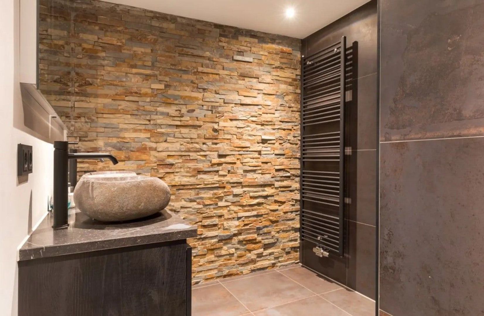 Badkamer, de badkamer straalt een unieke combinatie van luxe en rust uit. Het hoogtepunt is de zeer ruime inloopdouche, uitgerust met een luxe regendouche die naadloos in het plafond is geïntegreerd en een subtiele in de muur verwerkte thermostaatkraan. Deze moderne details zorgen voor een strak en minimalistisch design, terwijl ze tegelijkertijd een verkwikkende douche-ervaring bieden. De rustieke charme van de badkamer wordt versterkt door een zorgvuldig gekozen accentmuur en natuurstenen wasbakken, die een gevoel van kalmte en sereniteit oproepen. Het dubbele wastafelmeubel biedt niet alleen volop opbergruimte, maar is ook voorzien van een elegant marmeren blad dat de ruimte een tijdloze uitstraling geeft. Een matzwarte designradiator completeert het geheel, door zowel functionaliteit als stijl toe te voegen aan deze doordacht ingerichte badkamer.