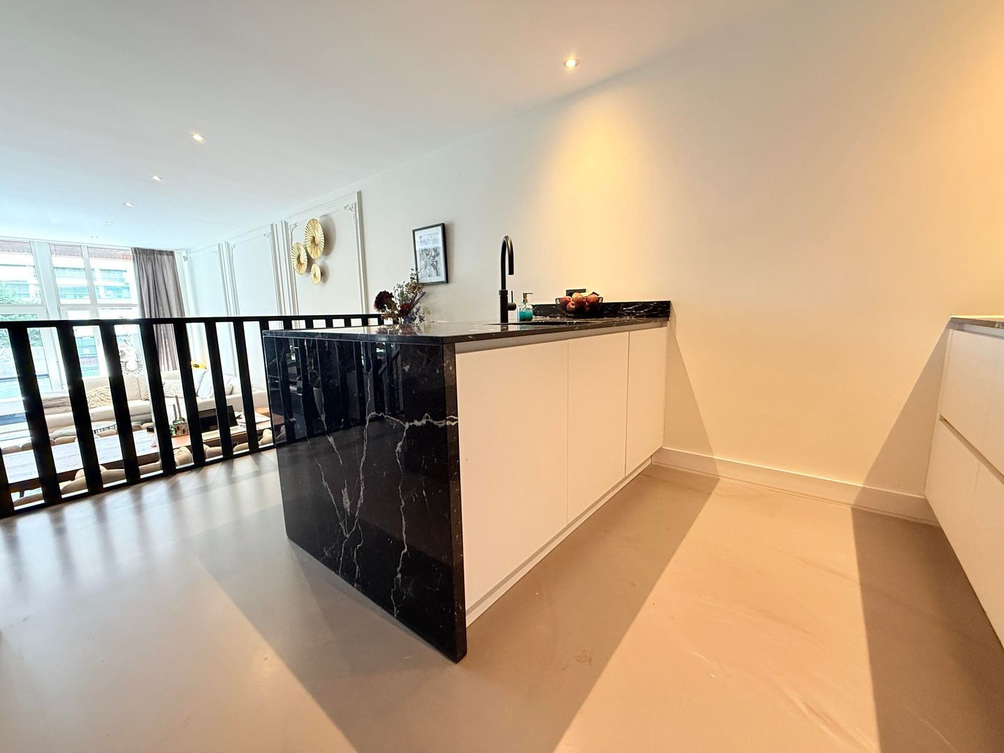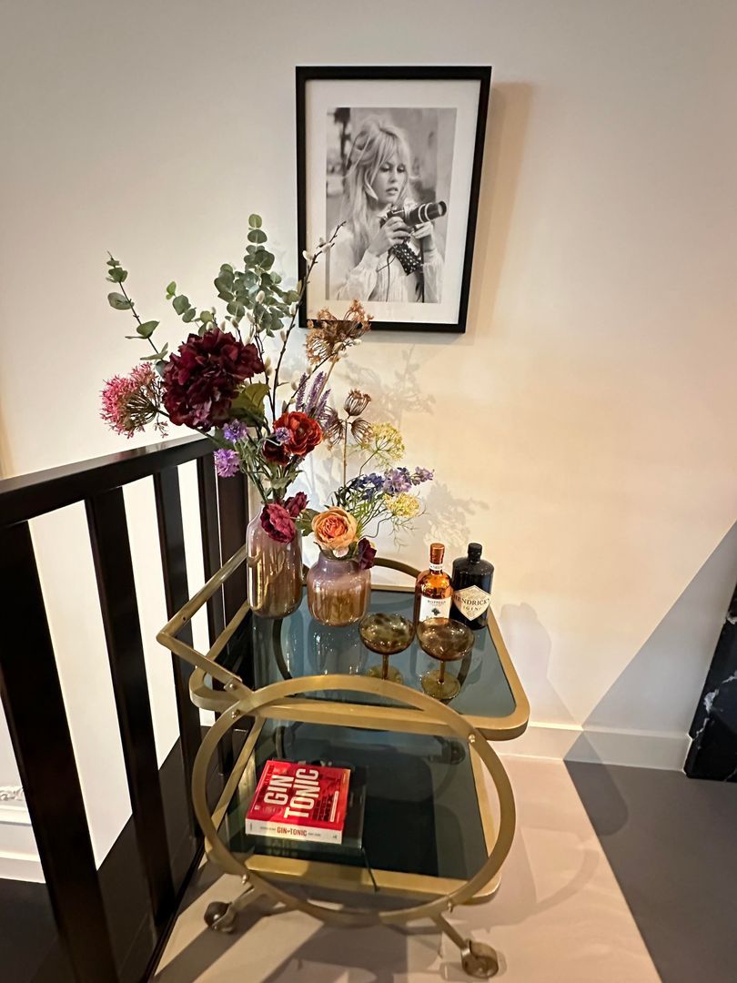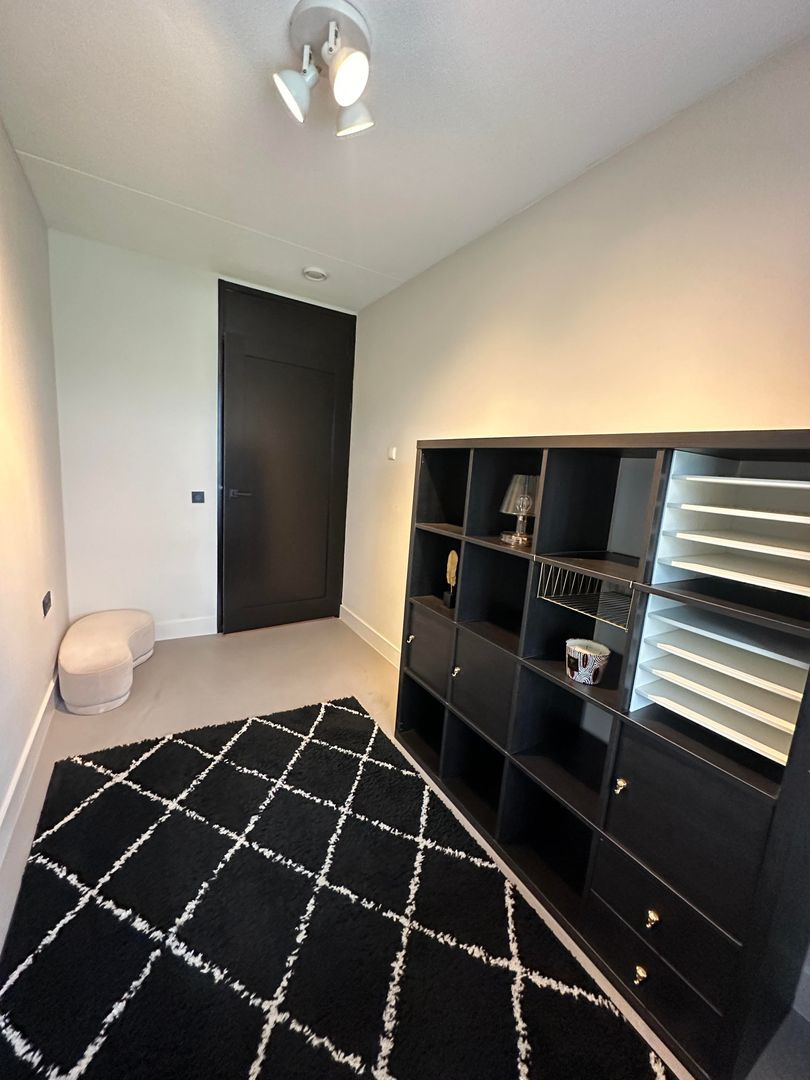 Entree, de entree van het appartement straalt een warme en hotelchique sfeer uit. De ruime hal biedt toegang tot het toilet, de woonkamer, de twee slaapkamers en de badkamer. De grote raampartijen in de woonkamer zorgen voor natuurlijk licht, wat bijdraagt aan de ruimtelijke en open sfeer in de entree. De glazen tussendeur versterkt dit effect ook, waardoor het licht vrij door de verschillende ruimtes kan stromen. De naadloze gietvloer, die doorloopt van de hal naar de keuken, de bijkeuken en naar één van de twee slaapkamers, zorgt voor een strakke en moderne uitstraling en is erg onderhoudsvriendelijk. Het appartement is voorzien van stadsverwarming, met de meterkast ook in de entree van het appartement.