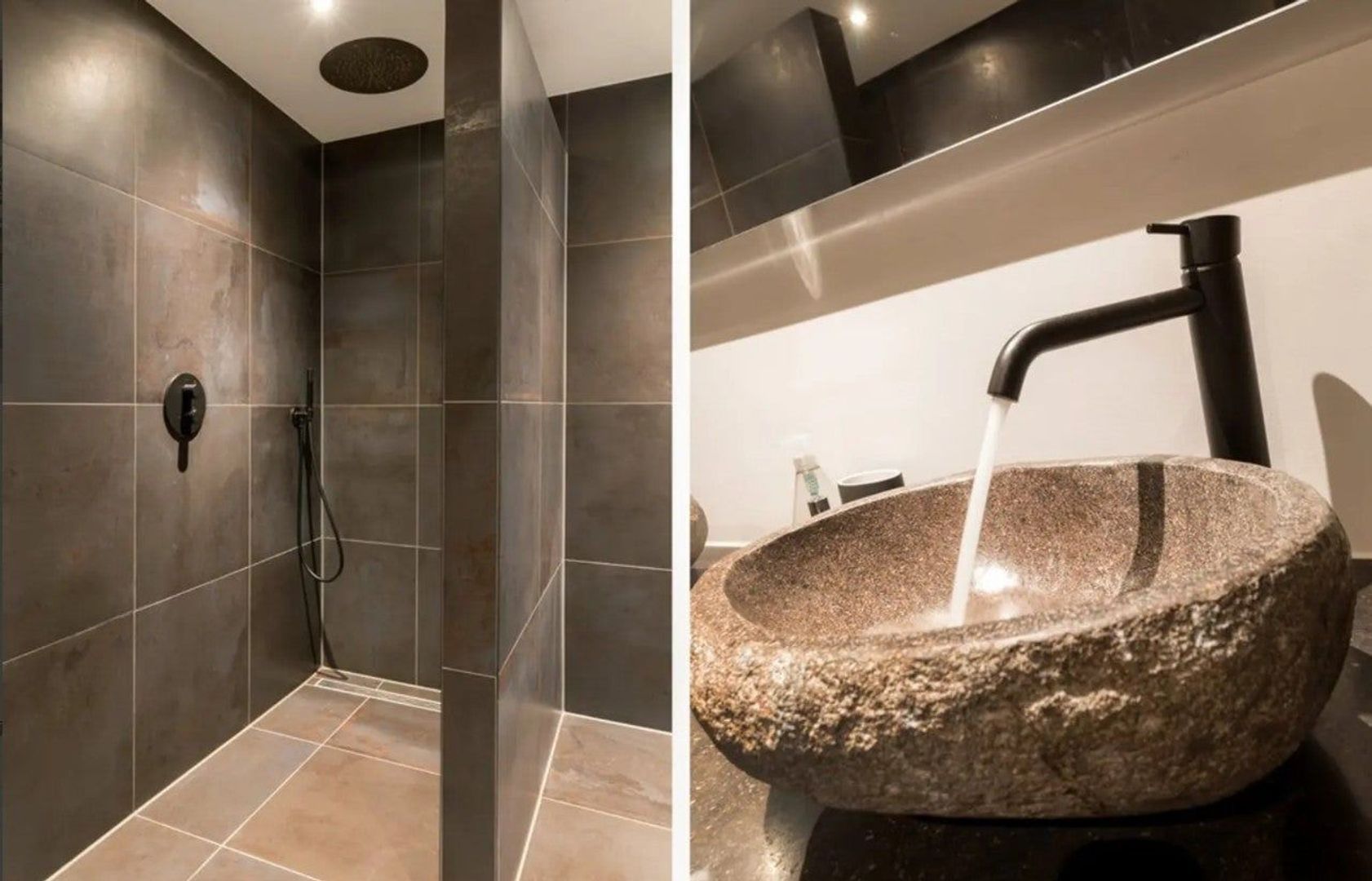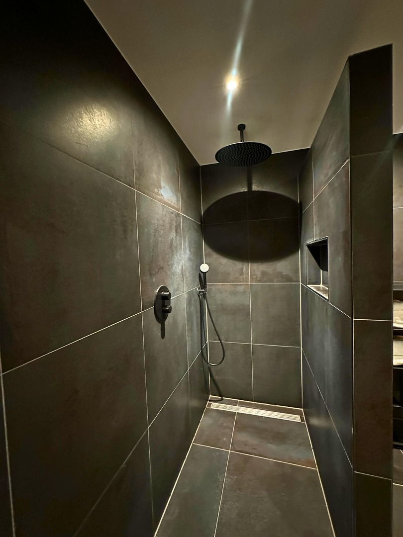 Badkamer, de badkamer straalt een unieke combinatie van luxe en rust uit. Het hoogtepunt is de zeer ruime inloopdouche, uitgerust met een luxe regendouche die naadloos in het plafond is geïntegreerd en een subtiele in de muur verwerkte thermostaatkraan. Deze moderne details zorgen voor een strak en minimalistisch design, terwijl ze tegelijkertijd een verkwikkende douche-ervaring bieden. De rustieke charme van de badkamer wordt versterkt door een zorgvuldig gekozen accentmuur en natuurstenen wasbakken, die een gevoel van kalmte en sereniteit oproepen. Het dubbele wastafelmeubel biedt niet alleen volop opbergruimte, maar is ook voorzien van een elegant marmeren blad dat de ruimte een tijdloze uitstraling geeft. Een matzwarte designradiator completeert het geheel, door zowel functionaliteit als stijl toe te voegen aan deze doordacht ingerichte badkamer.