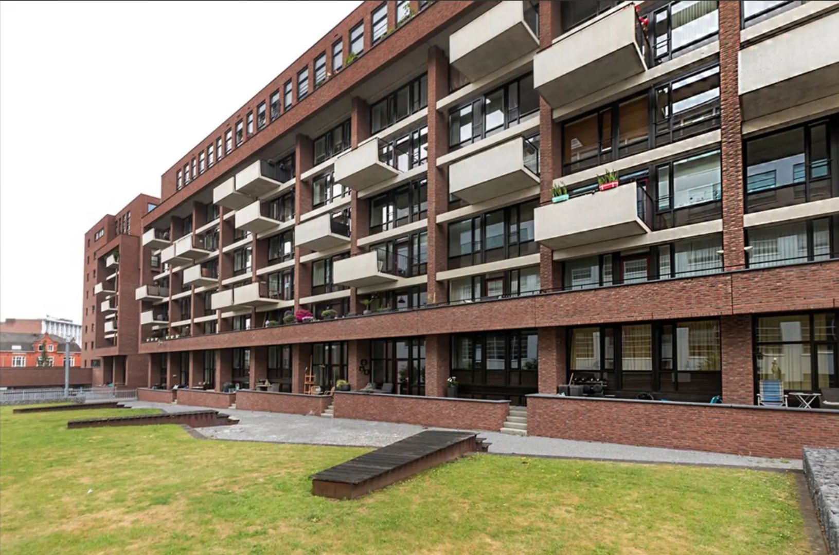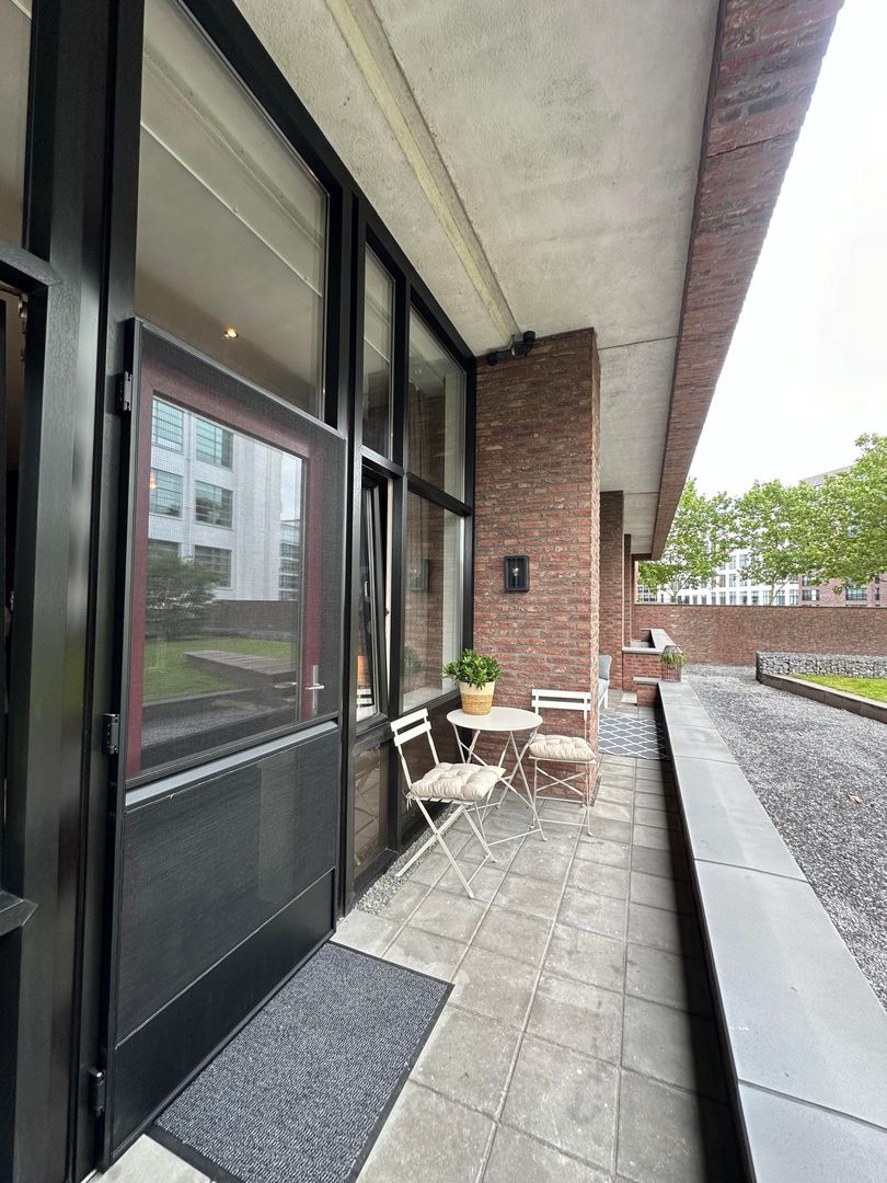 Terras, vanuit de woonkamer heb je directe toegang tot een breed balkon, waar je in alle rust kunt genieten van de buitenlucht, kijkend op de gezamenlijke buitenruimte en op het iconische gebouw De Witte Dame. Dit ruime balkon is voorzien van een hangstoel, een bistroset, een loungebank en een barbecue. Ideaal voor ontspanning en helemaal klaar voor gezellige momenten. Vanuit het balkon is er ook direct toegang tot de afgesloten, gezamenlijke en rustige binnentuin.