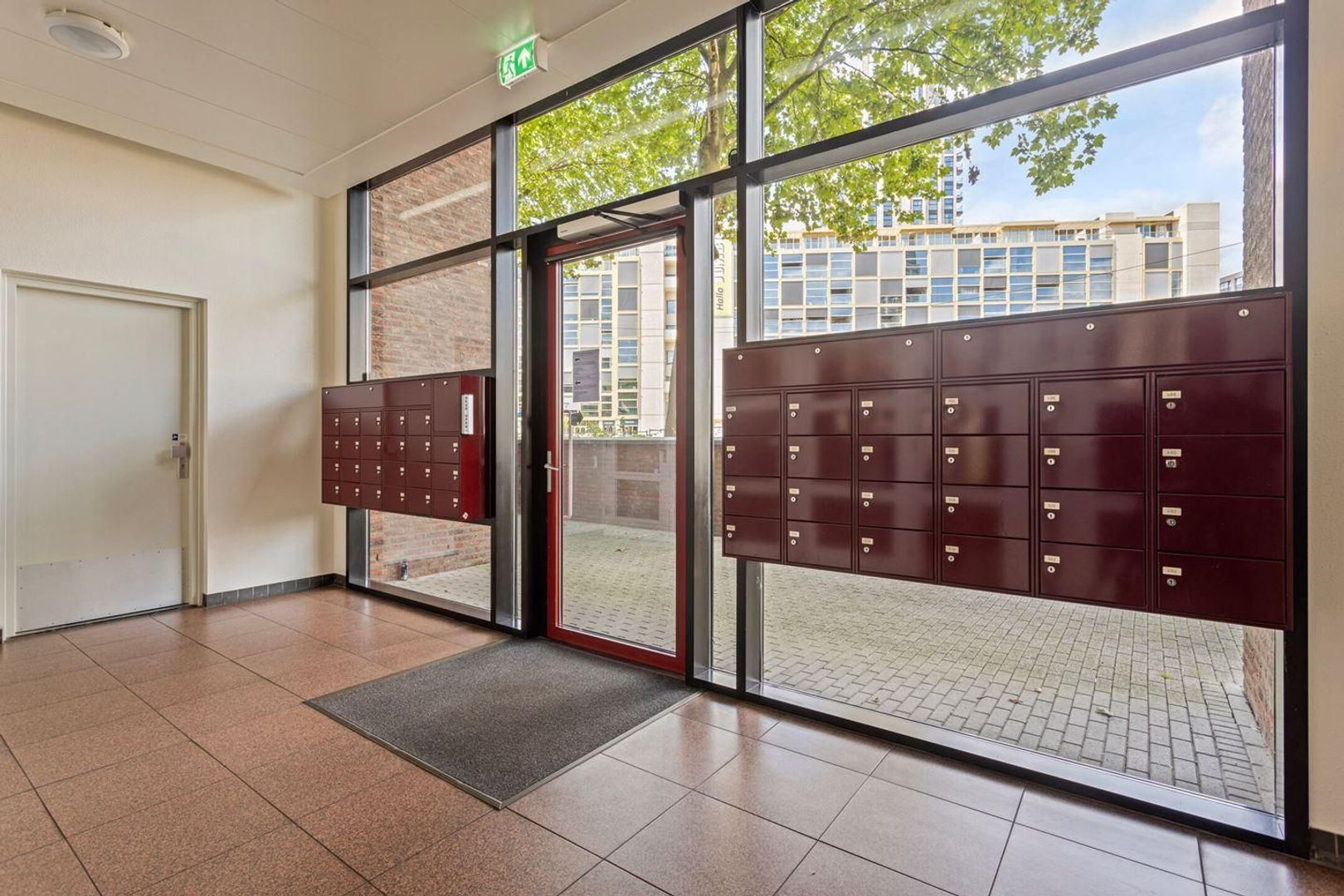 Begane grond, bij binnenkomst in het gebouw word je verwelkomd in een stijlvolle centrale hal, uitgerust met een modern bellen- en brievenbussentableau. Hier vind je ook de lift die je naar de eerste verdieping brengt, waar dit exclusieve appartement zich bevindt. Vanuit de centrale hal is het appartement ook middels slechts één trap te bereiken. Tevens zijn de berging en de gezamenlijke afvalruimtes met containers voor zowel oud papier als restafval, middels deze centrale hal te bereiken.