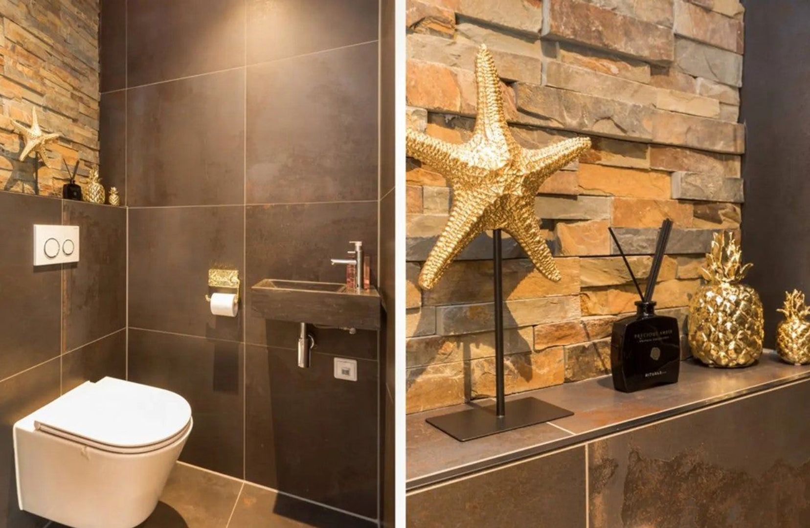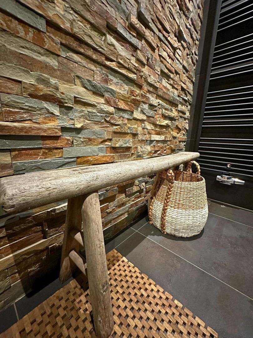 Toilet, het toilet is volledig betegeld en heeft een strak gestuct plafond met een ingebouwd reservoir. Een accentmuur achter het toilet geeft de ruimte een rustieke en luxe uitstraling. De zorgvuldig gekozen details, zoals de stijlvolle natuurstenen wasbak, maken van dit toilet een verfijnde ruimte.