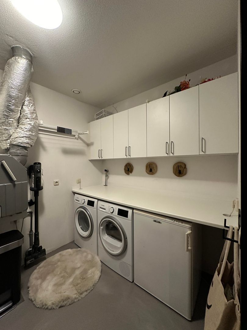 Keuken, bij binnenkomst in de keuken valt direct het strakke en moderne design op. Het ruime eiland biedt niet alleen voldoende werkruimte, maar ook een gezellige bar. Het marmeren blad in combinatie met de strakke en tijdloze keuken geeft de keuken een luxe, maar toch uitnodigende uitstraling. De hoogwaardige inbouwapparatuur, zoals een gloednieuwe recent geplaatste Quooker heetwaterkraan, een inductiekookplaat met geïntegreerde afzuiging en een ingebouwde koelkast maken van koken een plezierige ervaring. De keuken is ook volledig voorzien van servies, koffiezetapparaat, melkopschuimer en andere keukenbenodigdheden. Een praktische berging met extra keukenkasten is voorzien van een diepvriezer, wasmachine, droger, strijkplank en strijkbout, steelstofzuiger, droogrekken, poetsspullen zoals emmer, dweil, veger en blik en overige vrije opslagruimte.