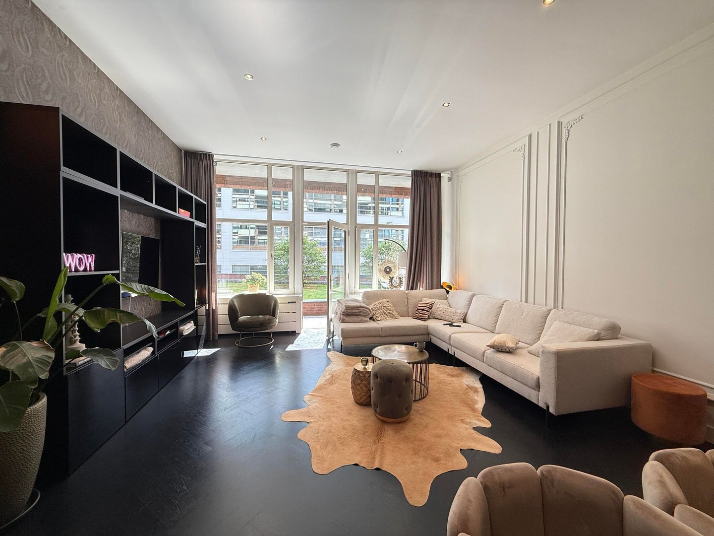 Woonkamer, de ruime woonkamer baadt in natuurlijk licht dankzij de grote en hoge raampartijen, die niet alleen een lichte en luchtige sfeer creëren, maar ook een uitzicht bieden op de zeer rustige binnentuin en op één van Eindhovens meest iconische gebouwen, De Witte Dame. Een interessant niveauverschil in de woonkamer – waarbij het woongedeelte iets lager ligt dan de rest – zorgt voor een unieke, speelse indeling en natuurlijke scheiding van de verschillende leefruimtes. De donkere houten visgraatvloer versterkt de moderne uitstraling van de woonkamer en draagt bij aan de stijlvolle ambiance. De woonkamer is voorzien van een smart-tv, een grote en luxe gestoffeerde hoekbank welke recent is aangekocht en volledig ongebruikt is. Daarnaast biedt de grote kast door middel van vakken, kasten en lades nog eens extra opbergruimte.