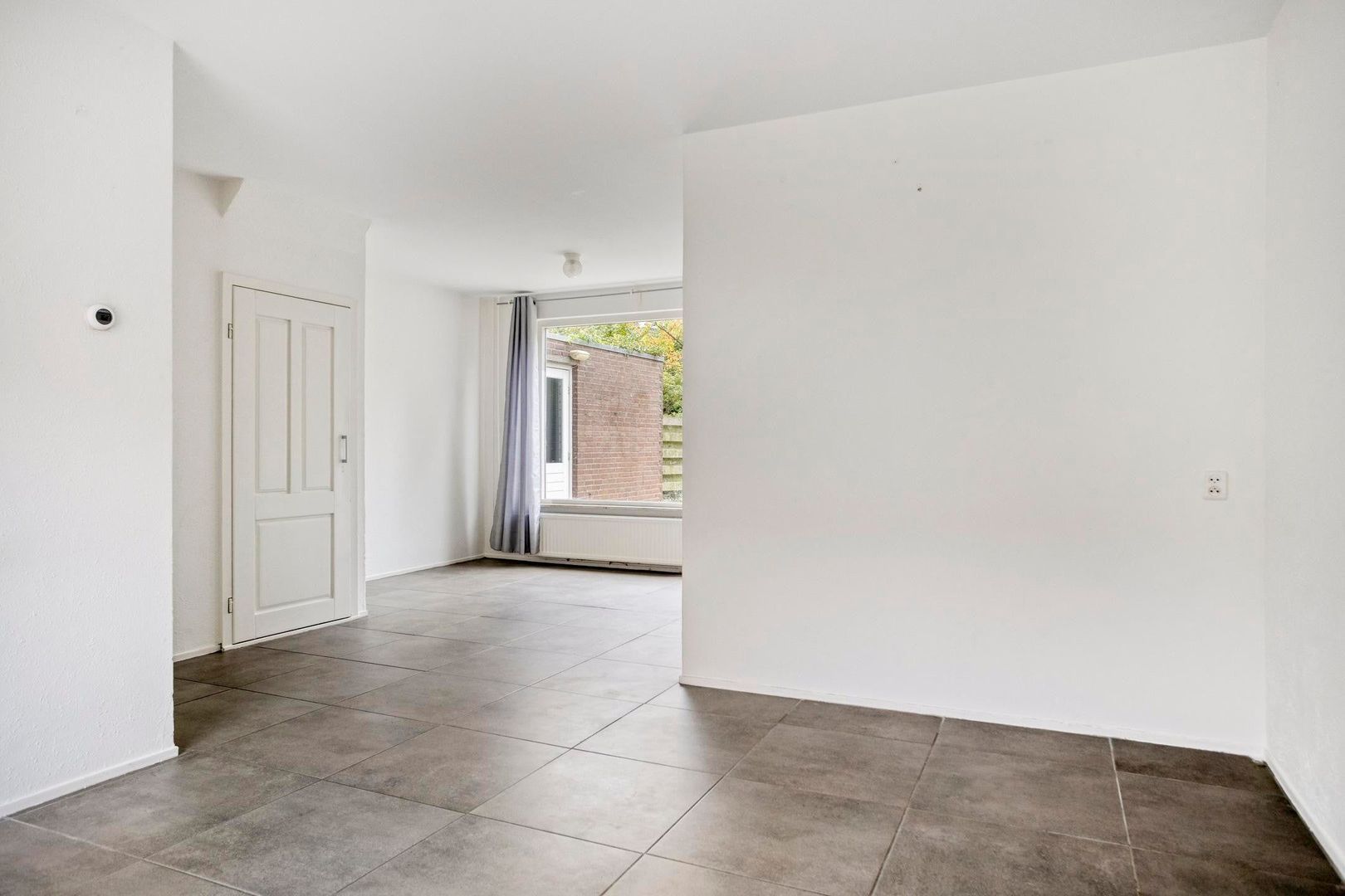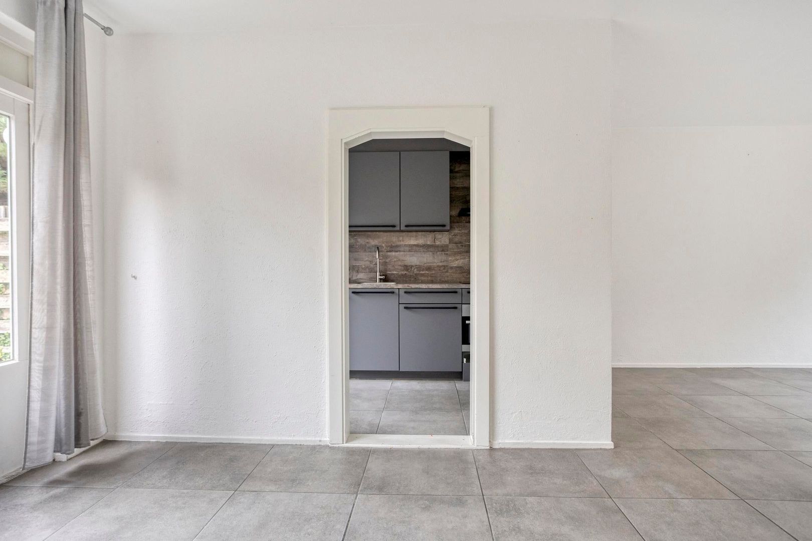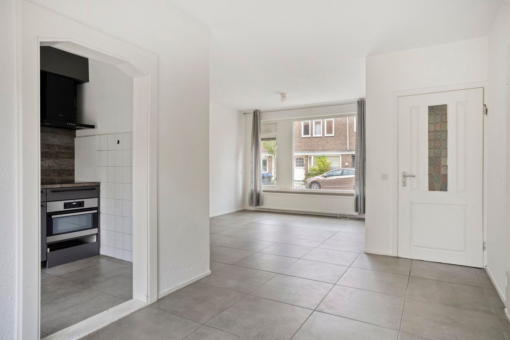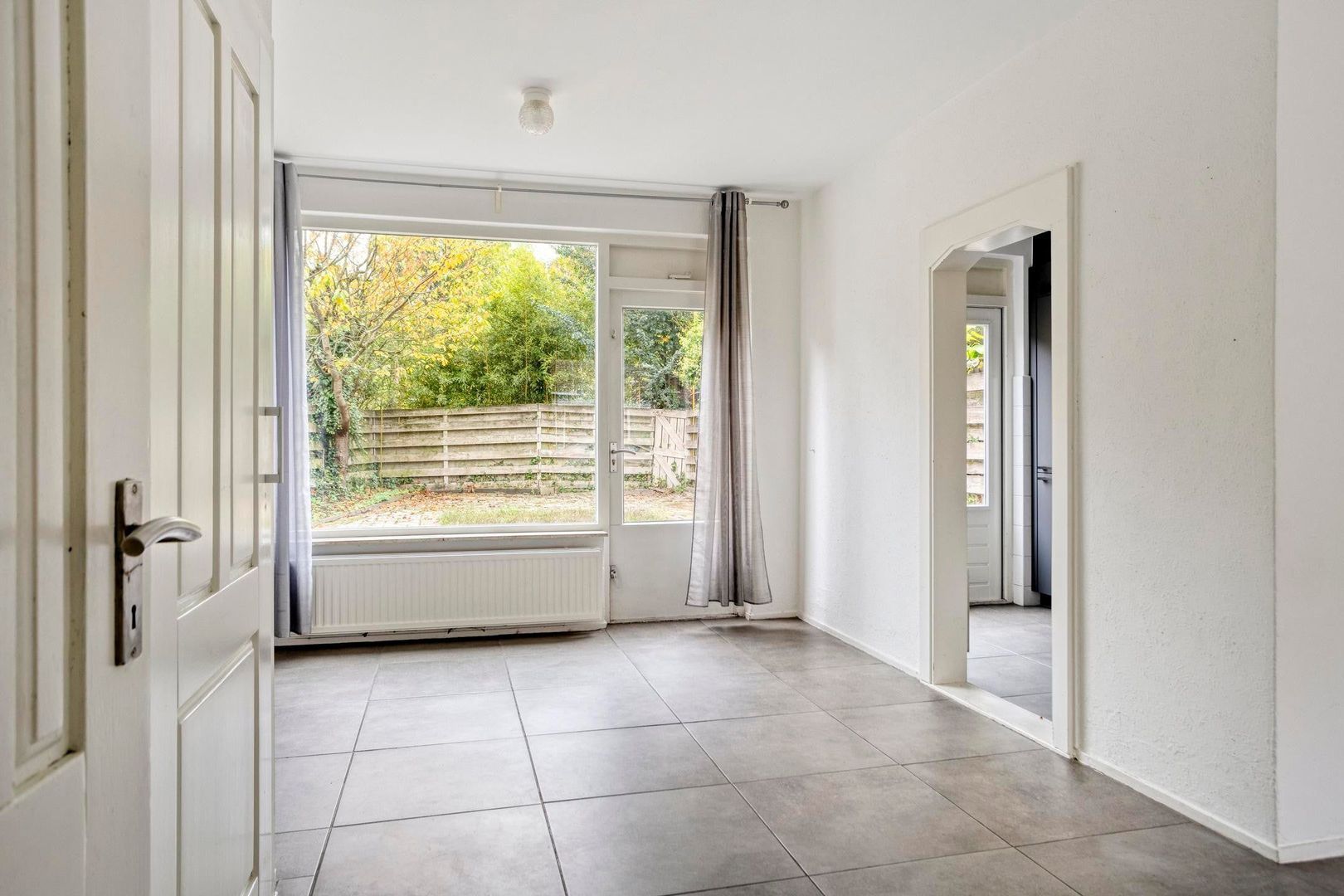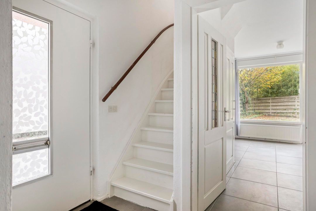 De ruime doorzonwoonkamer voelt direct warm en uitnodigend aan dankzij de moderne betonlook tegelvloer, strakke wanden en karakteristieke details zoals de originele glas-in-lood tussendeur. Onder de trap bevindt zich extra bergruimte. Via de woonkamer stap je direct de zonnige tuin in.