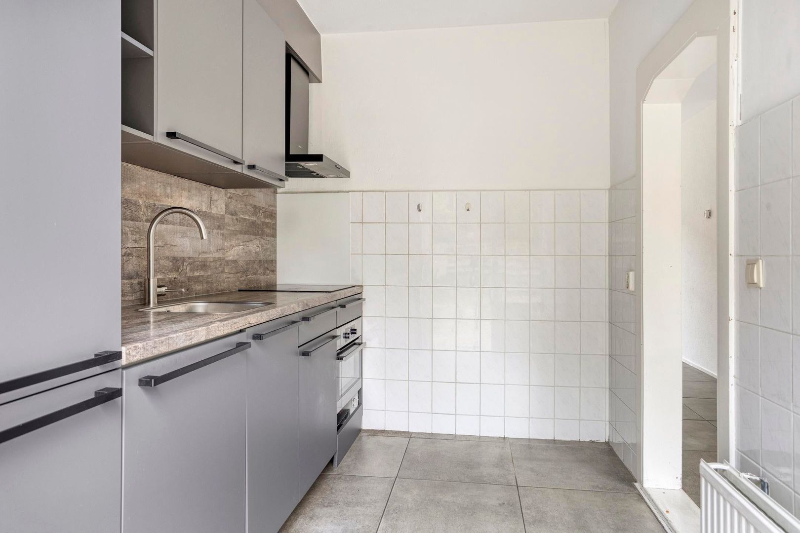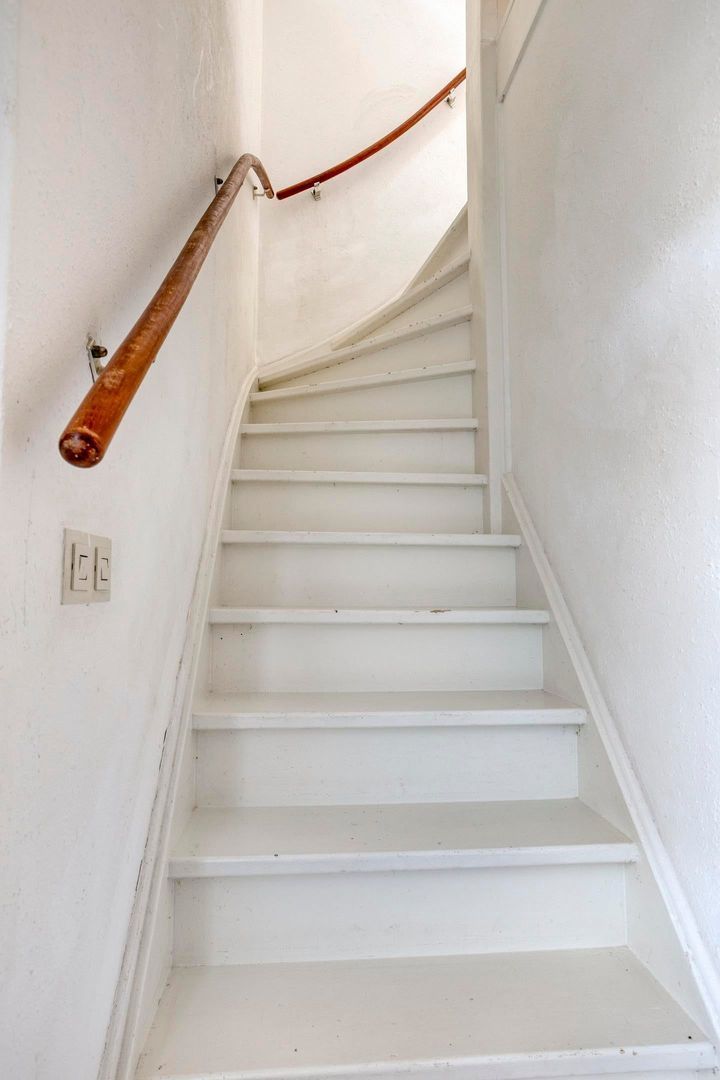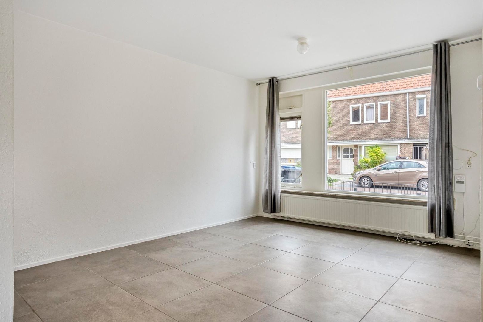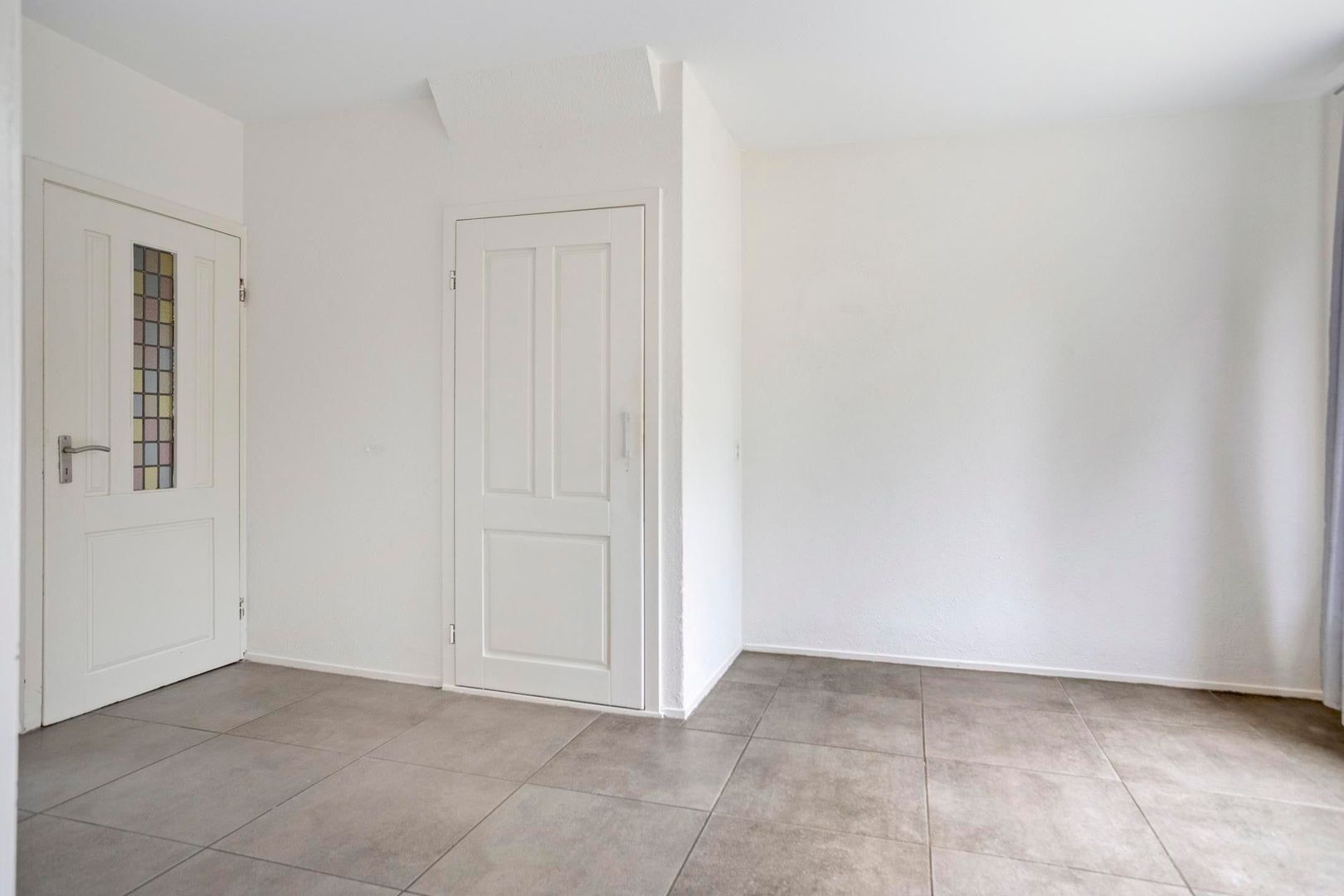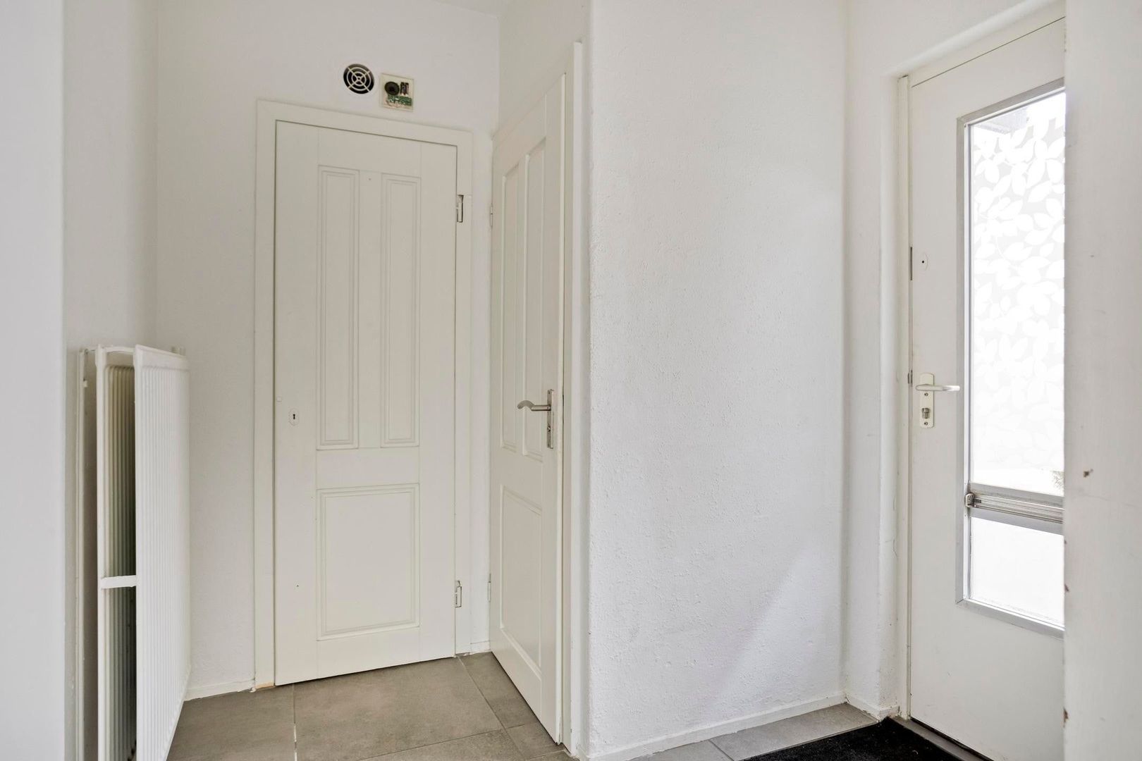 De ruime doorzonwoonkamer voelt direct warm en uitnodigend aan dankzij de moderne betonlook tegelvloer, strakke wanden en karakteristieke details zoals de originele glas-in-lood tussendeur. Onder de trap bevindt zich extra bergruimte. Via de woonkamer stap je direct de zonnige tuin in.