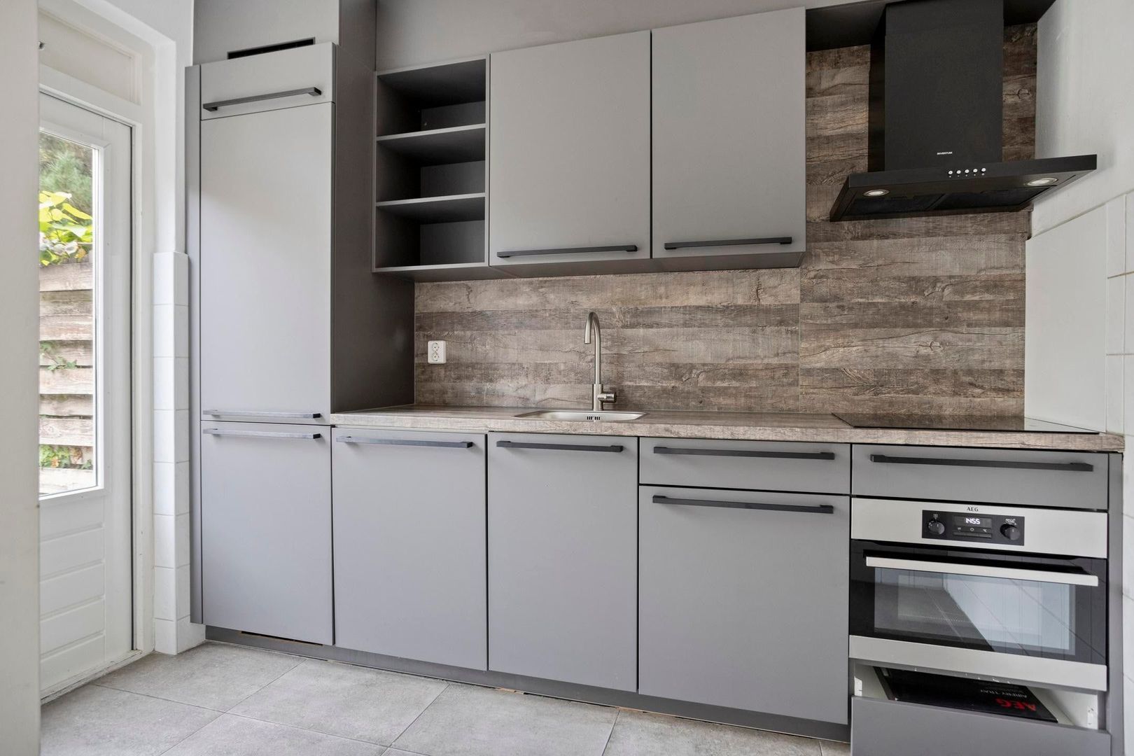 De moderne keuken is netjes afgewerkt en uitgerust met alle benodigde inbouwapparatuur: een inductiekookplaat, combi-oven, vaatwasser en een stijlvol aanrechtblad met houtlook.