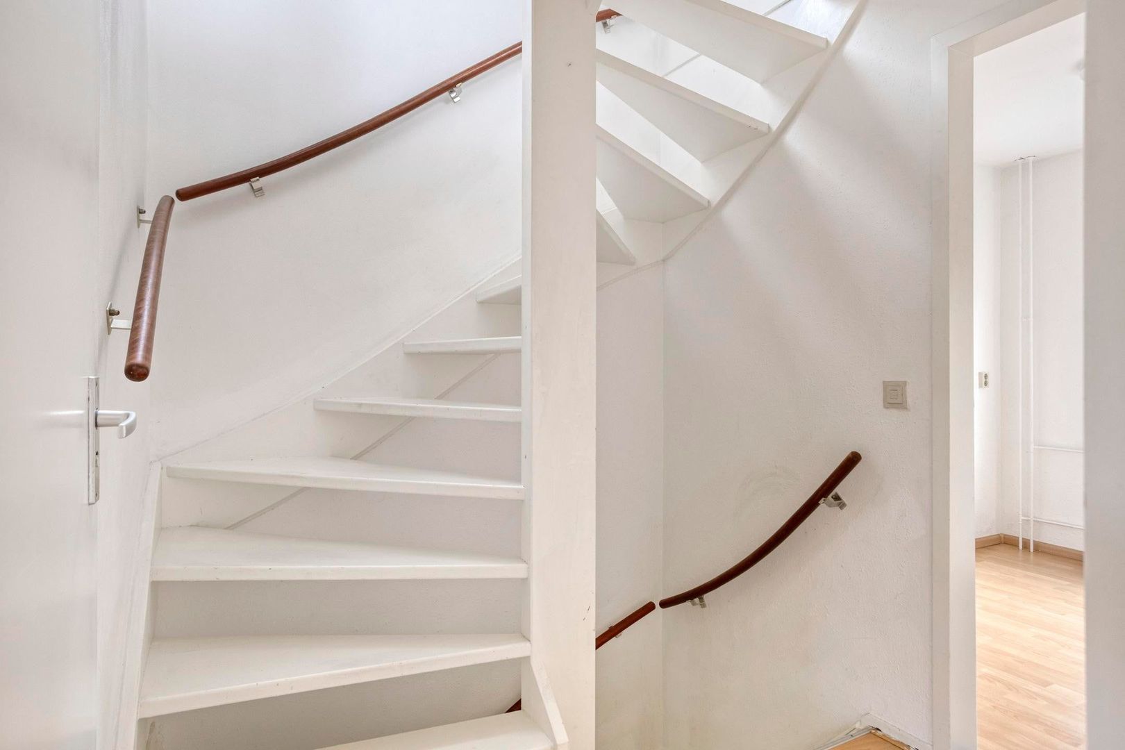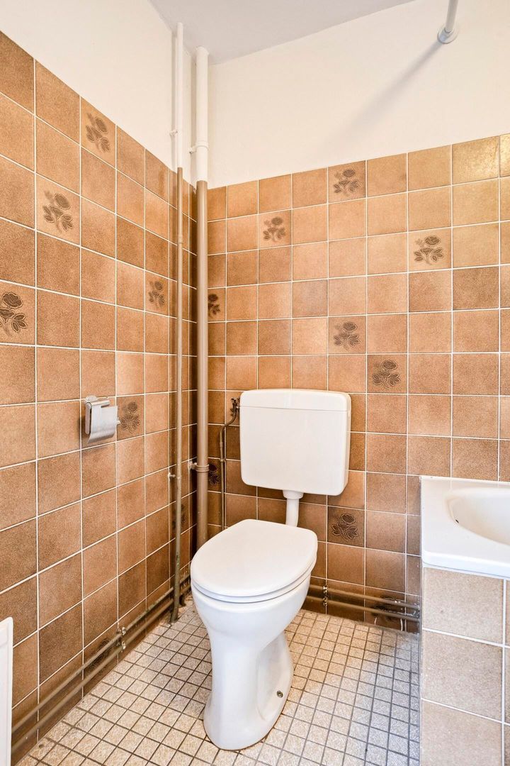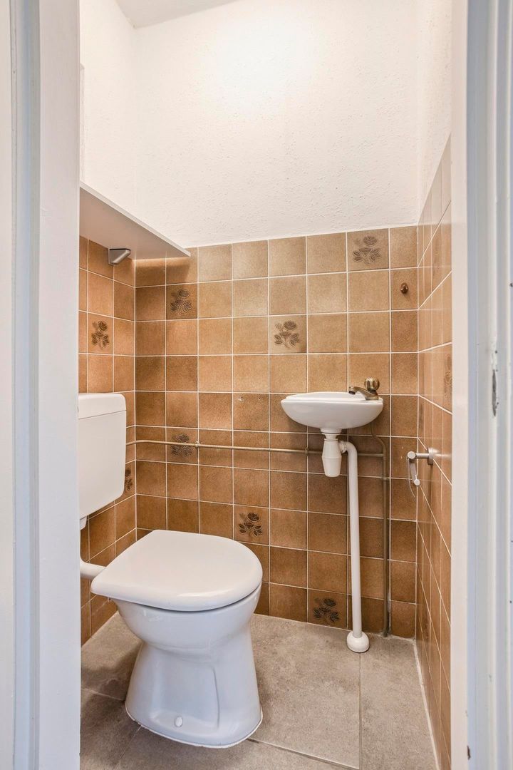 Je komt binnen in de hal met toegang tot de meterkast, het moderne toilet (voorzien van wandcloset en fonteintje) en de trap naar boven.
