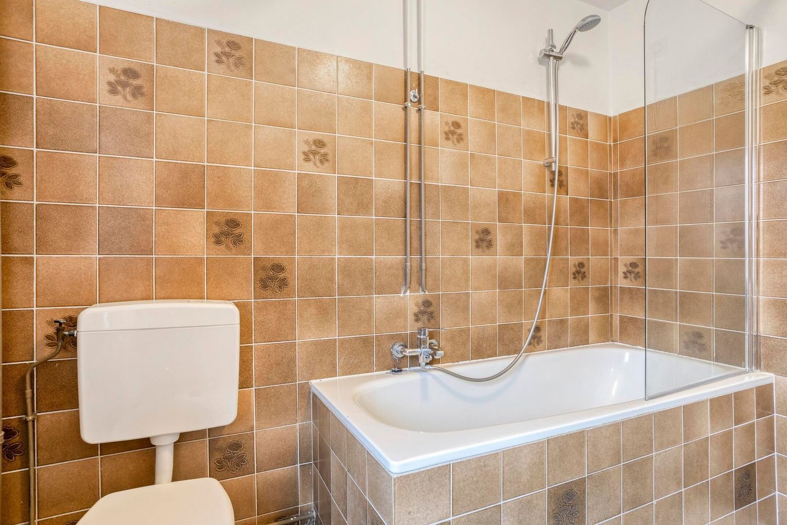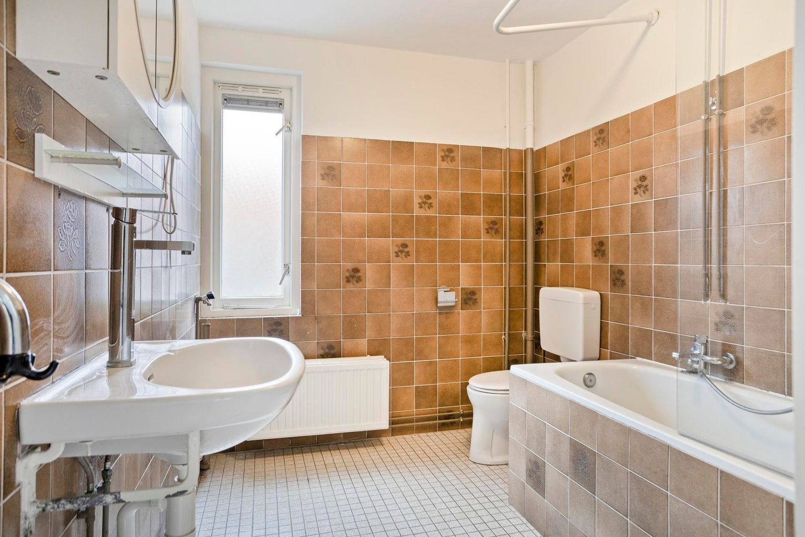 De nette badkamer beschikt over een ligbad met douche en thermostaatkraan, wastafel, radiator en aansluiting voor de wasmachine.