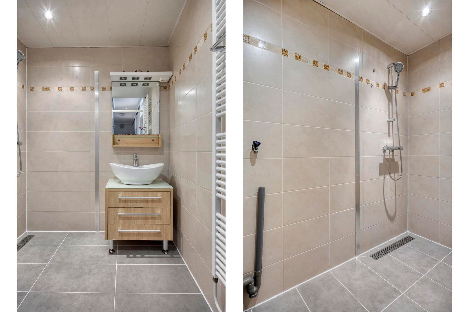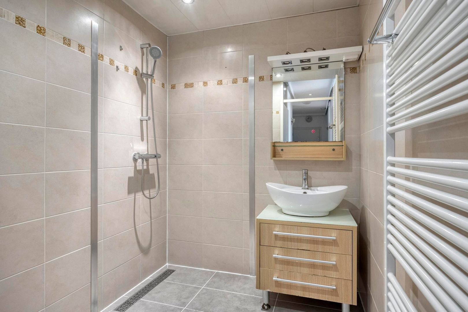 De badkamer is volledig betegeld en voorzien van douche en een wastafel.